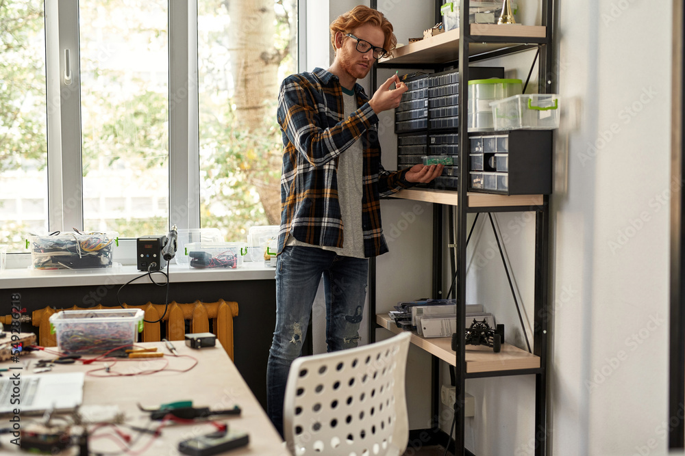 Smart IT engineer looking at computer component