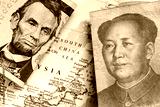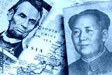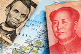 A US dollar bill and a yuan Chinese banknote on top of a map showing the South China Sea