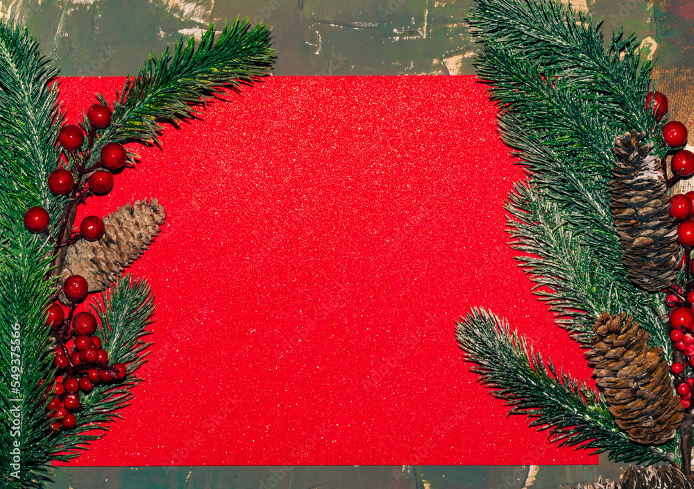 Christmas wooden background with fir branches and a plate with cutlery and a place to copy.