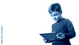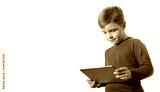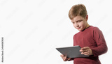 Banner Little boy boy playing tablet. White background. Red shirt.