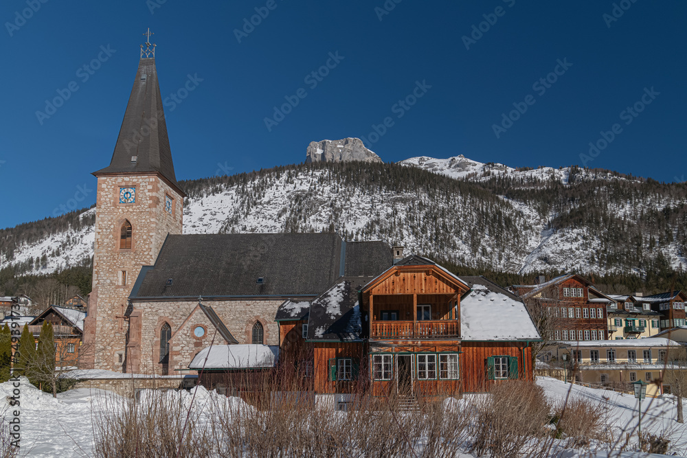 View of Altaussee in Ausseerland with Loser Mountain in Background, Salzkammergut, Austria