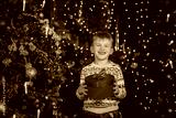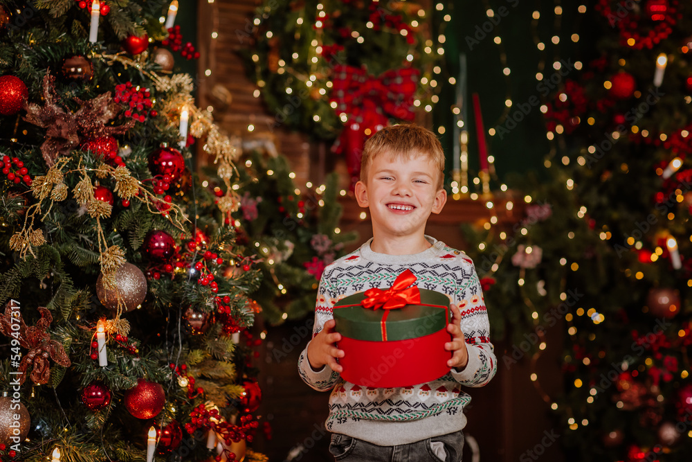 Boy in winter sweater holds Christmas present against holiday background.