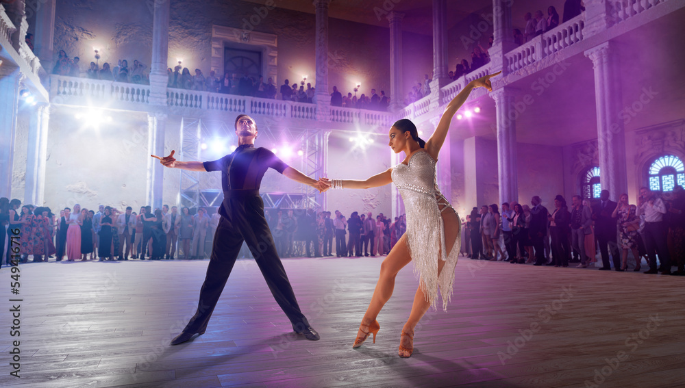 Couple dancers perform latin dance on large professional stage. Ballroom dancing.
