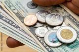 Panama money, American dollars and Balboa coins in hand, Close up, Financial concept, Rising money, Currency system in Panama