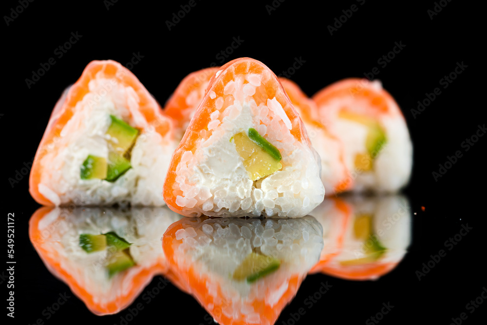 Set of sushi rolls Philadelphia with salmon, cream cheese, avocado, rice and nori.