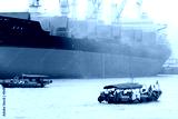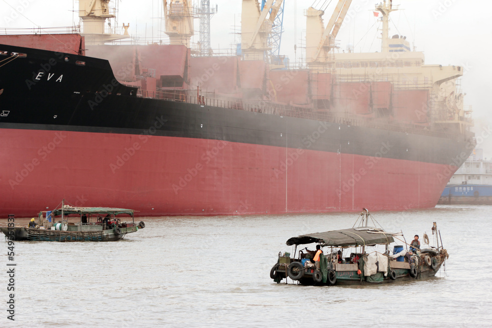 A traditional fishing vessel and newly constructed ships at the Huangpu river, Shanghai, China