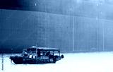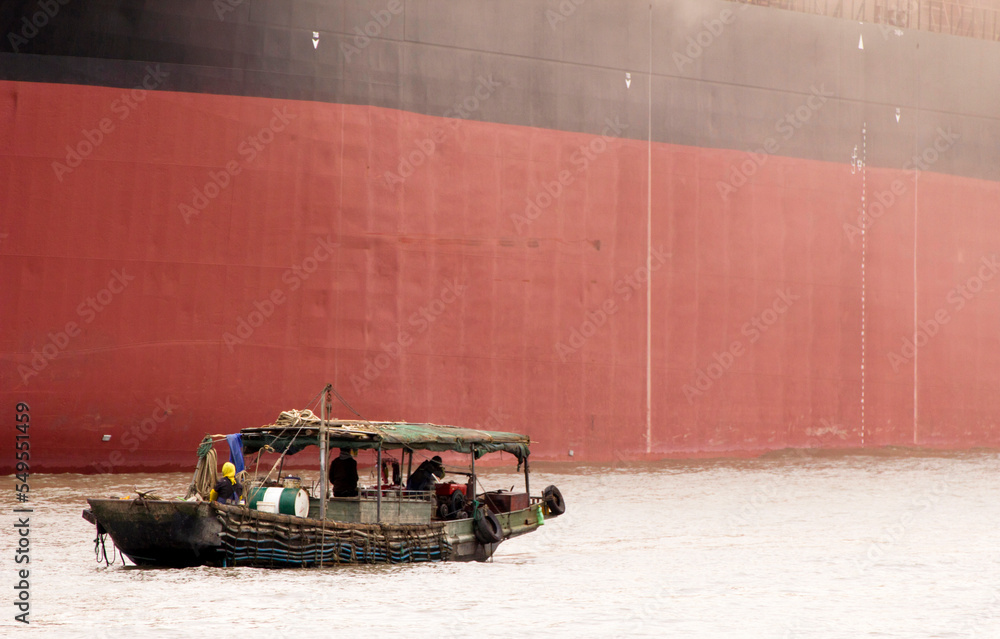 A traditional fishing vessel and newly constructed ships at the Huangpu river, Shanghai, China