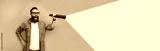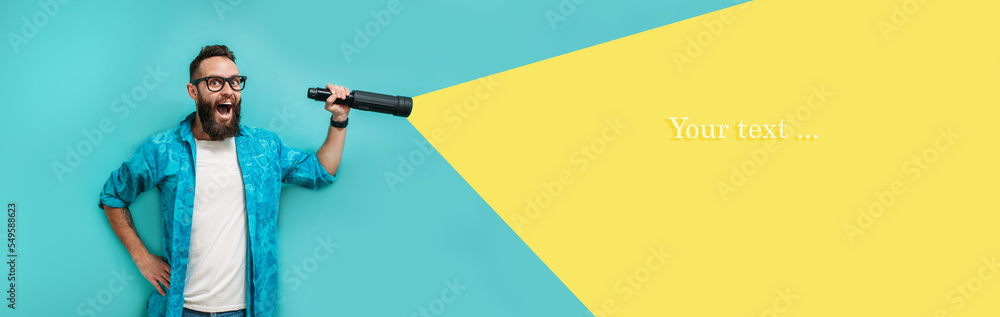 Young bearded hipster man holding a flashlight. Your text here. Discounts, sales, seasonal sales. Colorful summer concept. Modern creative artwork.