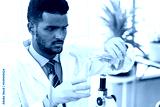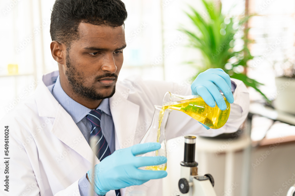 Happy male scientist working in lab. Smiling Scientist woman with yellow liquid in a researcher test tube.