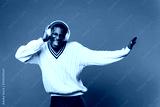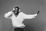 Black young man dancing and listening music with headphones