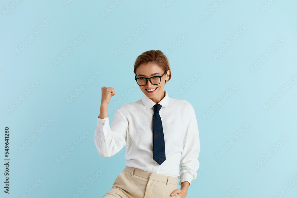 Excited Businesswoman Rejoicing Isolated. Portrait of Overjoyed Girl Standing with Raised Hands and Shouting Yeah, I'm Winner, Rejoicing Victory, Success. Studio Shot Isolated on Blue Background