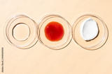 Cosmetic textures in glass containers on a beige background top view. Body cream, serum, scrub close-up.