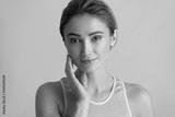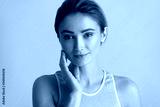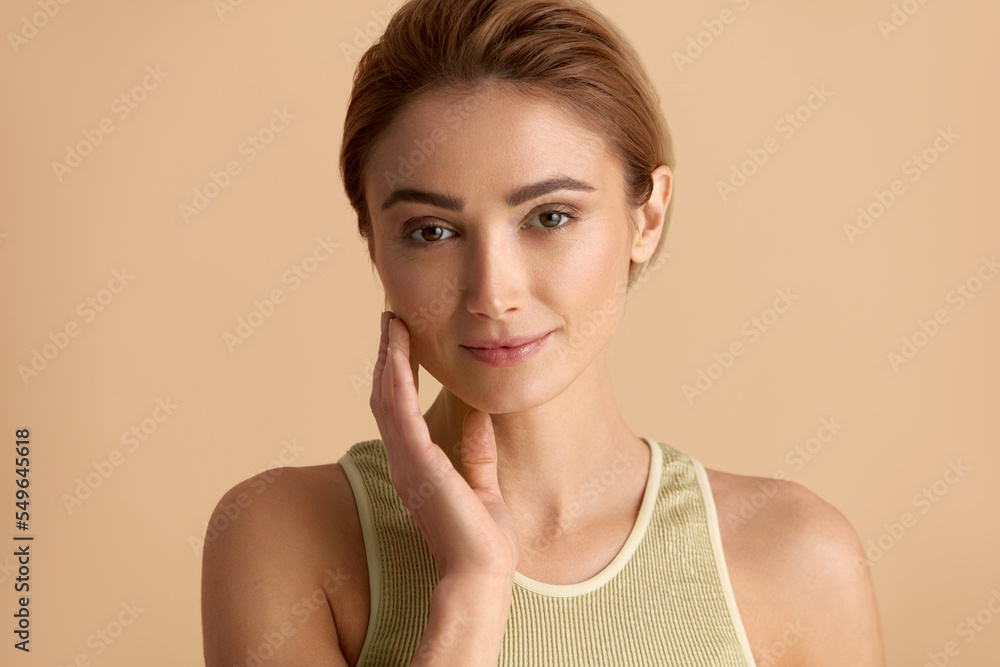 Smiling Woman Touching Face. Waist Up Portrait of Attractive Woman Touching Her Skin And Smiling. Woman Appearance and Skin Care Concept