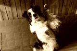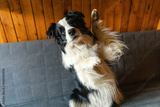 Funny portrait of puppy dog border collie waving paw sitting on couch. Cute pet dog resting on sofa at home indoor. Funny emotional dog, cute pose. Dog raise paw up