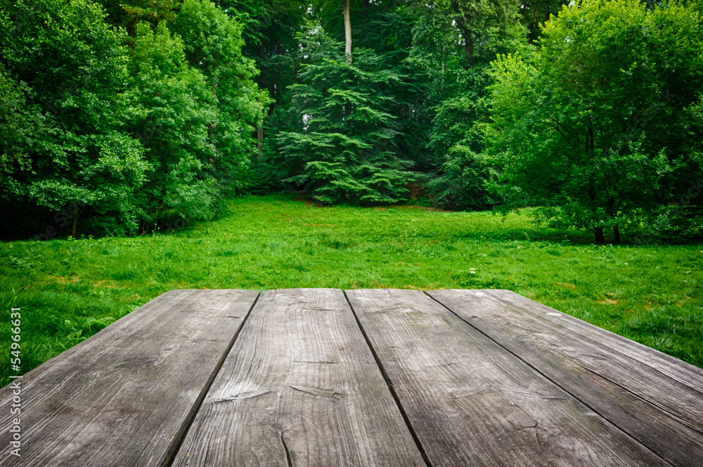 Wooden table with green nature background