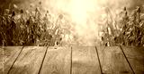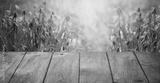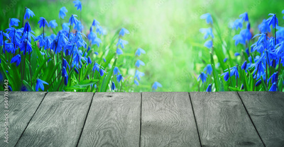 empty wooden table from old boards against the background of a spring garden and the first blooming blue flowers, mock-up for design