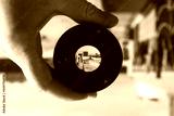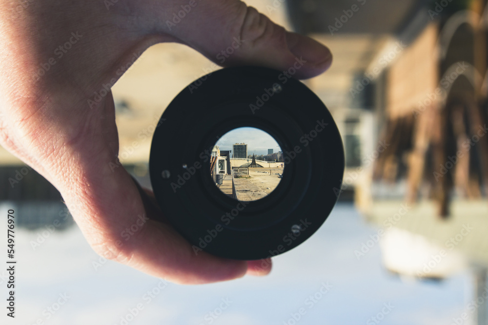 Sandy beach with Playground and houses in the background, view through the lens, image inside is inverted