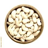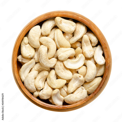 Cashew nuts, raw cashews in a wooden bowl. Seeds of shelled cashew tree fruits, Anacardium occidentale. Snack nuts, can be eaten on its own, used in recipes or processed into cashew butter or cheese.