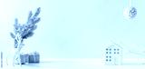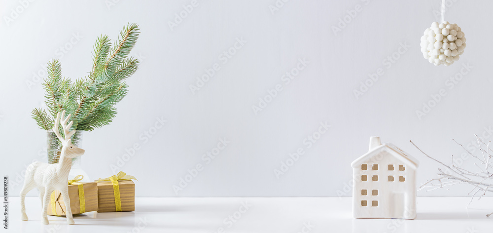 Christmas, New Year home decor. Empty white wall mock up with green fir branches in a vase, deer and gift box on a white table. Mock up for displaying works