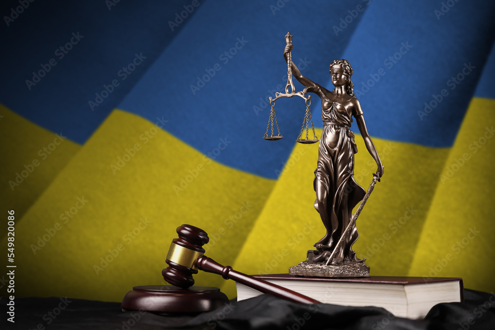 Ukraine flag with statue of lady justice, constitution and judge hammer on black drapery. Concept of judgement and guilt