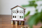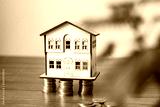 Real estate investment and home mortgage finance. Risk management concept. Wooden house on pile of coins
