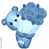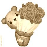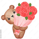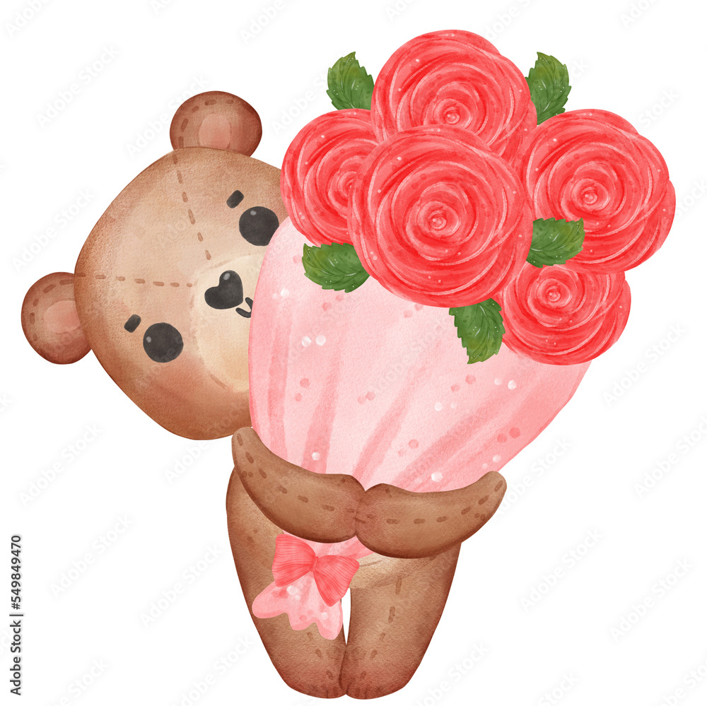 cute sweet Valentine brown teddy bear with roses bouquet watercolour hand drawing