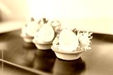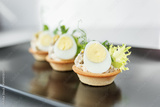 Exquisite appetizers from chef. Close-up of tartlet with quail egg and chicken and microgreens