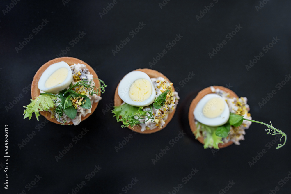 Exquisite appetizers from chef. Close-up of tartlet with quail egg, cheese and microgreens