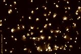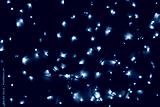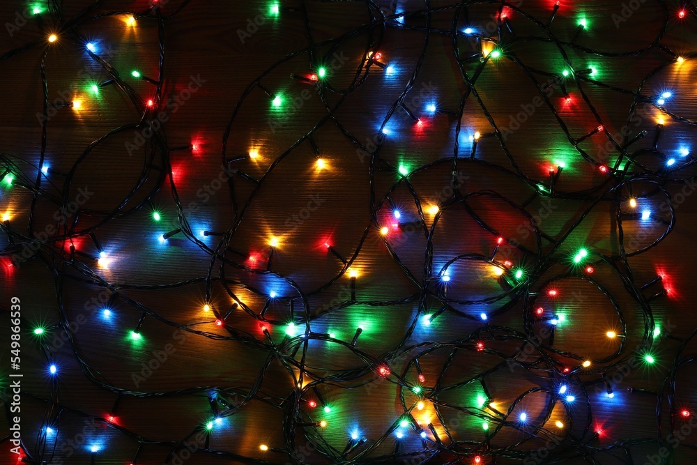 Colorful Christmas lights on wooden table, top view