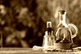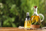 Bottles with cooking oil, olives and rosemary on wooden table against blurred background. space for text