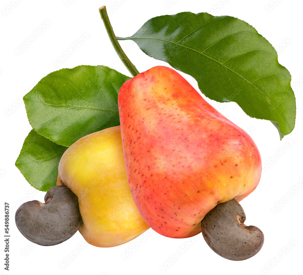 Fresh cashews and cashew nut with leafs on a white background, Fresh cashew nut on White Background PNG File.