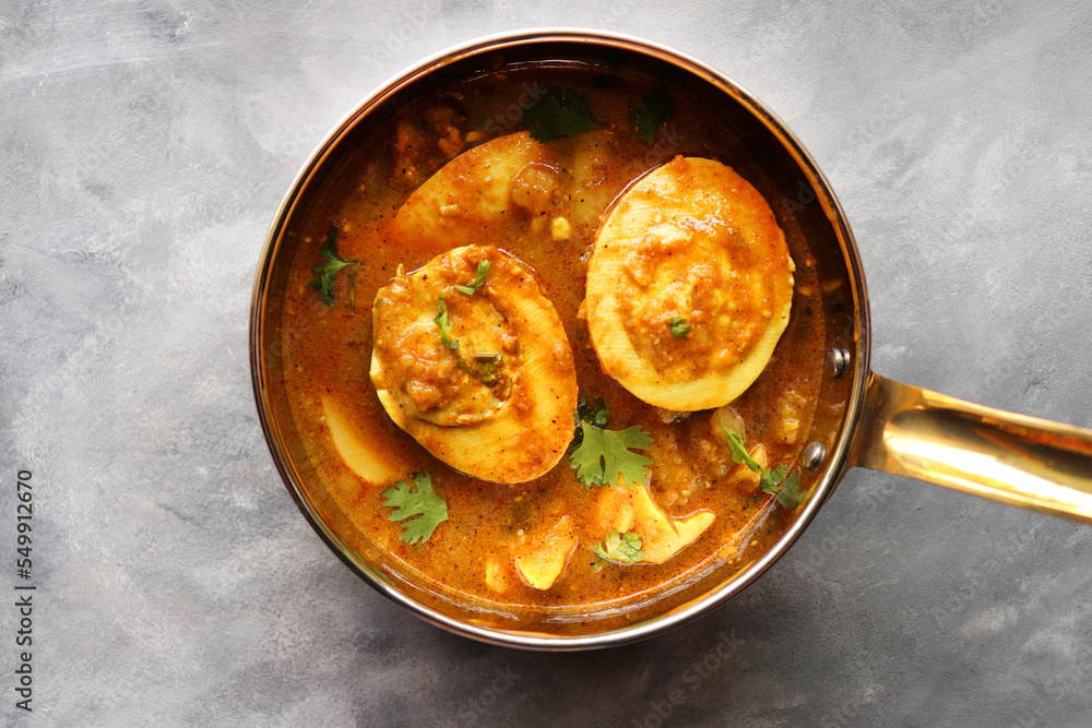 Egg Curry or Anda masala gravy, baida curry. Indian spicy food. Indian nonvegetarian Homemade food. Perfect Indian lunch. over moody background with copy space.