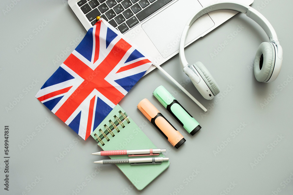 Concept of online learning English, foreign languages, distance education, knowledge, modern study. Laptop, English flag, headphones, notebook, markers. Grey background. Copy space. Nobody. Top view.