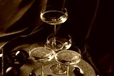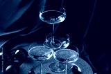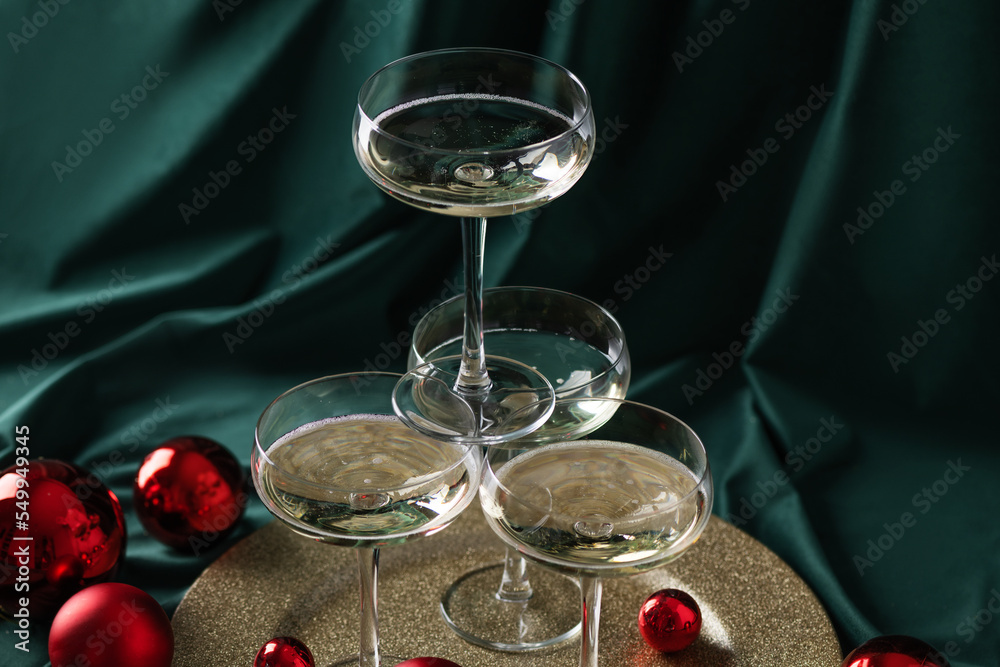 Merry Christmas and Happy New Year. Glass of champagne with red Christmas ornaments over green velvet curtain.