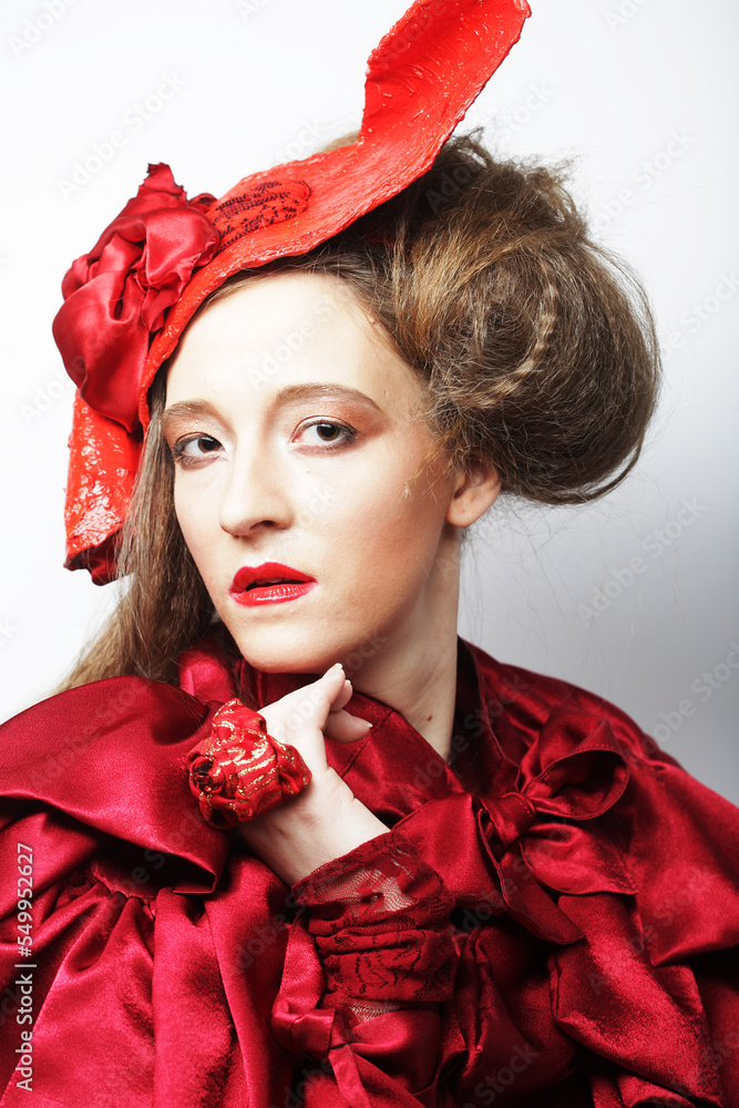 Young beautiful woman in a red lace suit and hat. A stylish blonde in scarlet, a symbol of passion and energy