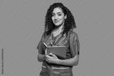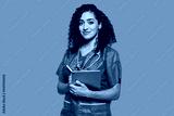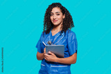 Horizontal medium studio portrait of smiling african medical female worker wearing blue uniform holding digital tablet looking at camera, isolated over blue background.