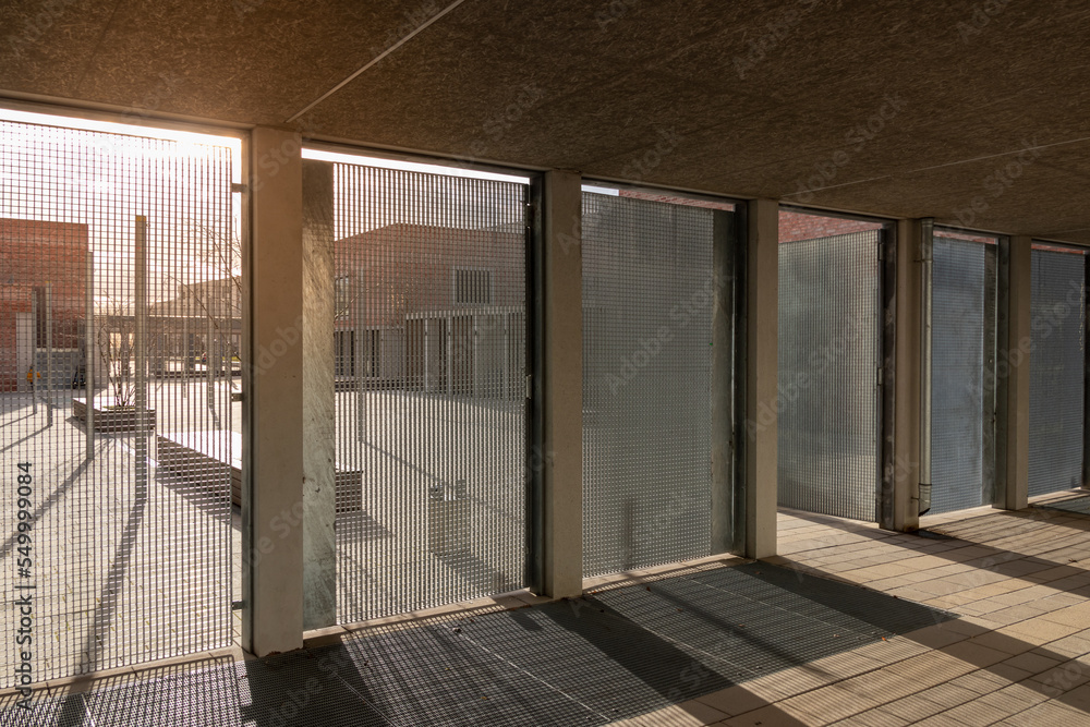 Interior shot of a building with sun shining on the background