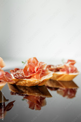 Appetizer with prosciutto, bruschetta and sun-dried tomato. Food, restaurant and event concept.