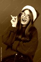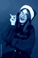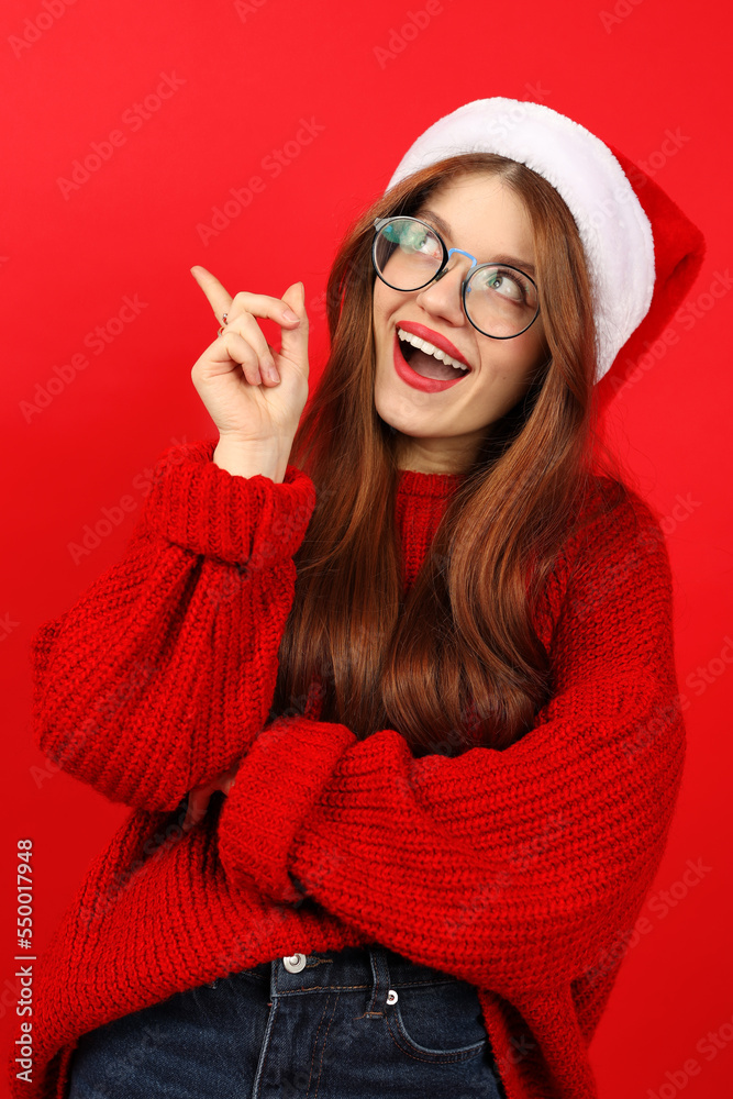 Christmas idea. Young woman on a red background in a Santa hat. vertically.