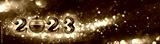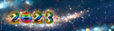 Happy New Year 2023. Christmas or New Year composition with rainbow numbers and Christmas rainbow ball on festive background with colorful bokeh.