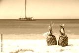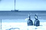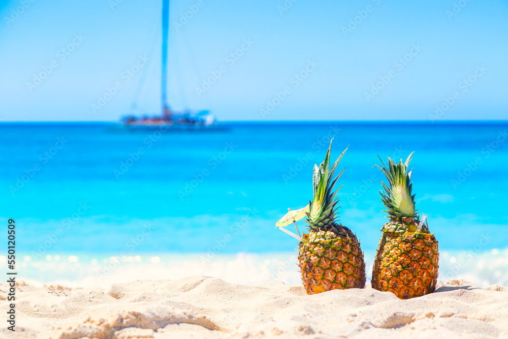 Travel vacation background. Tropical pineapples cocktails pina colada on caribbean beach with ocean and ship. Saona island, Dominican Republic.