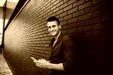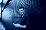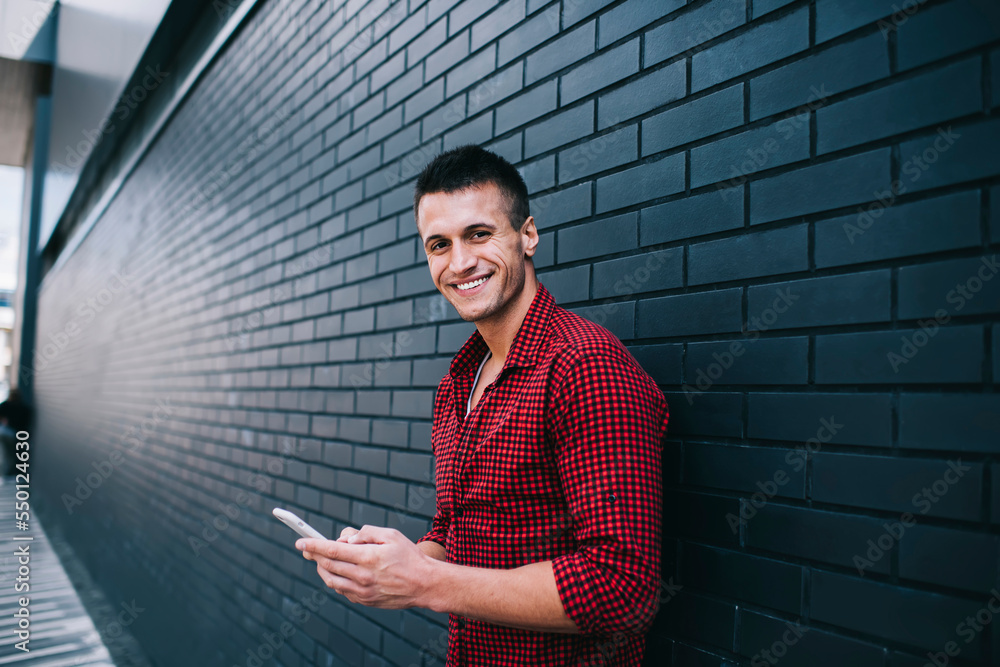 Half length portrait of handsome young man holding smartphone device on copy space background. 30 years old millennial male using mobile phone app and browsing internet. Online banking