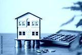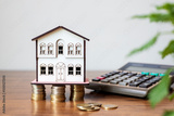 Real estate investment and home mortgage finance. Risk management concept. Wooden house on pile of coins