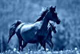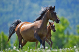 Arabian Horse Mare and Foal playing, running together at summer pasture.
