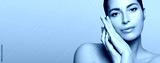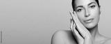 Beauty and Skin Care Concept. Beautiful natural woman with clean healthy luminous skin. Panorama banner with lateral grey copyspace