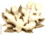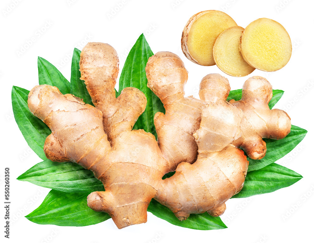 Ginger root and ginger slices with green leaves. File contains clipping paths.