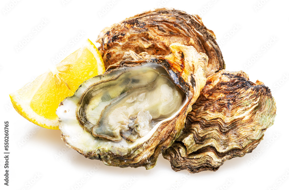 Opened and closed raw oysters isolated on white background. Delicacy food.