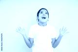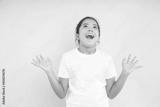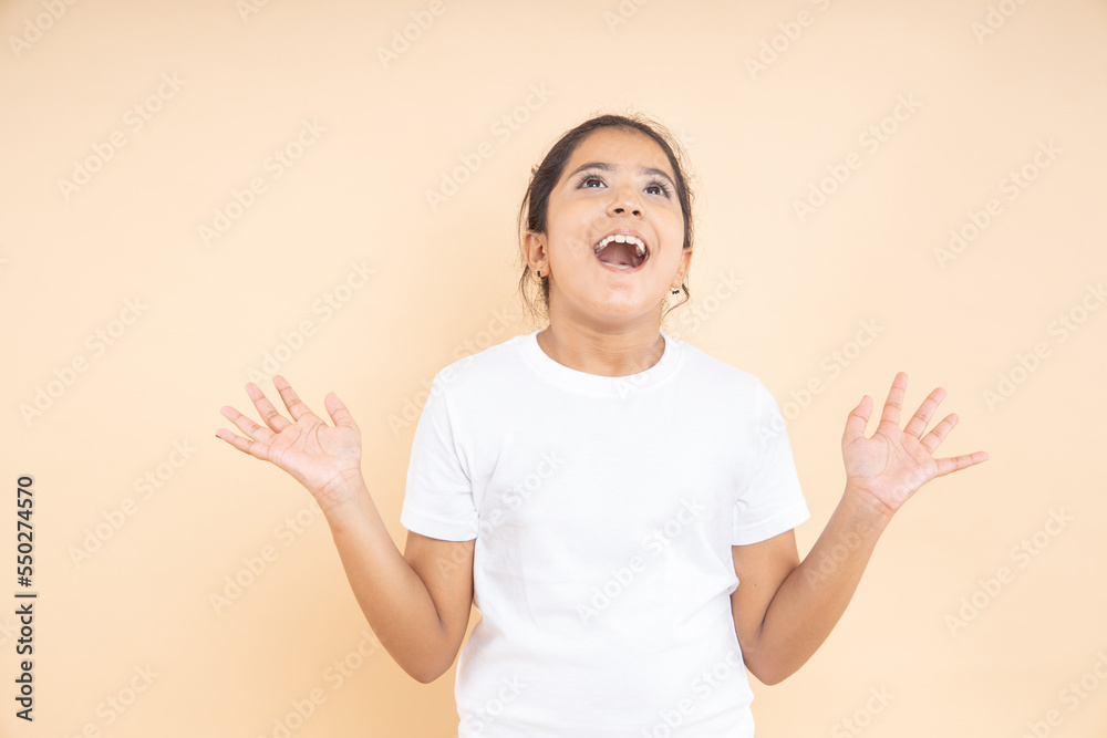 Amazed little indian girl looking up with open arms gesture isolated over beige background. Imagination and day dreaming concept.