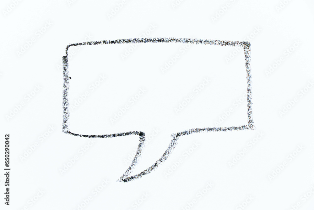 Black color oil pastel hand drawing in square speech banner shape on white paper background