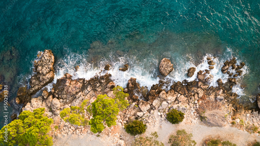 Beautiful azure blue Mediterranean beach surrounded by green trees in Croatia